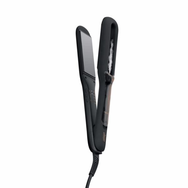 La Plancha profesional CARBON PRO Ion Led STEINHART con placas de cerámica tratadas con aceite de argán, macadamia y keratina para un acabado brillante y sin frizz. Calentamiento rápido, temperatura ajustable entre 150 °C y 230 °C. Cable profesional de 3 m con giro 360° y apagado automático.