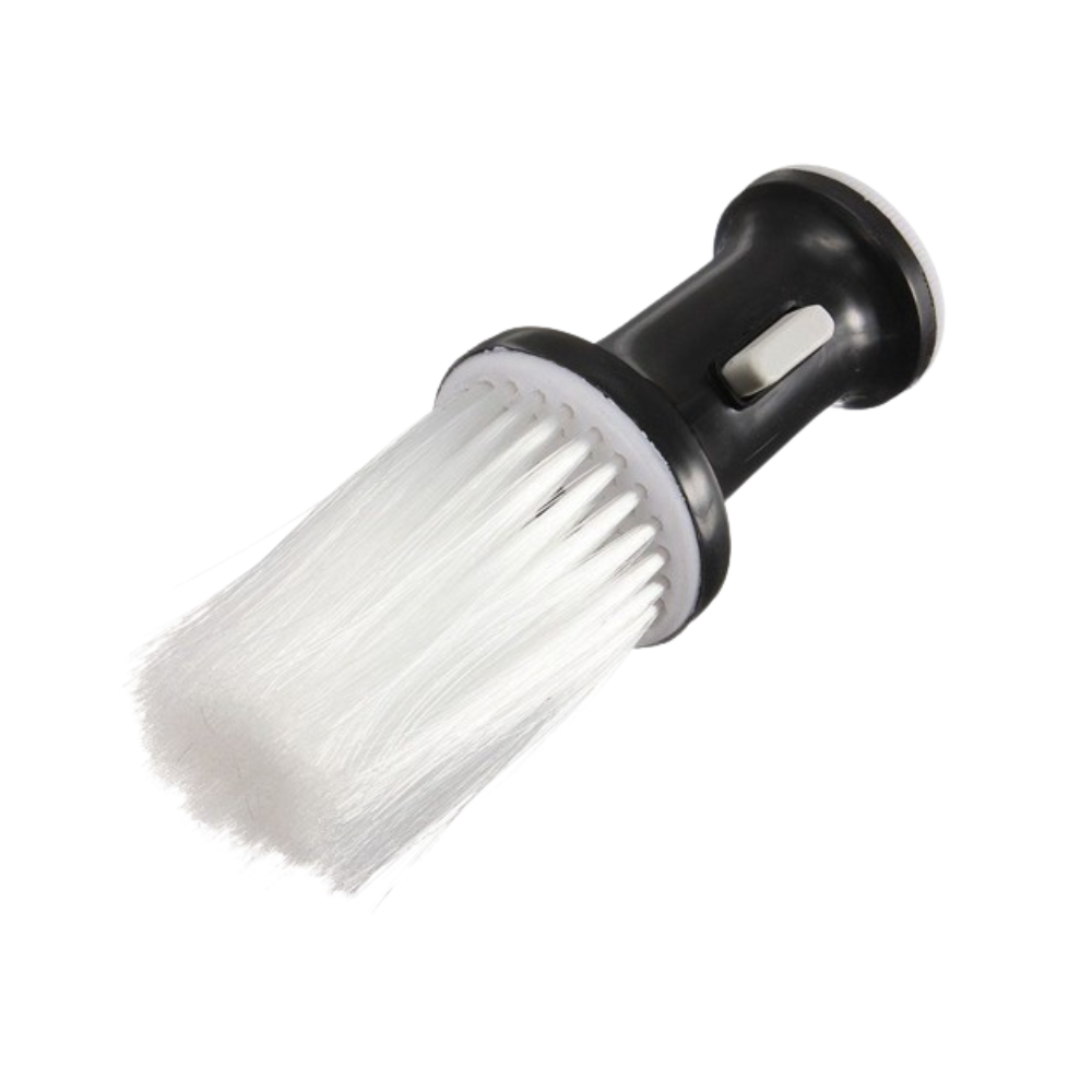 El Cepillo Talco Cuello Negro elimina los restos de cabello del cuello y rostro con cerdas de nylon ultra suaves e incorpora un depósito de talco con aplicación por botón, ideal para un acabado limpio y profesional.
