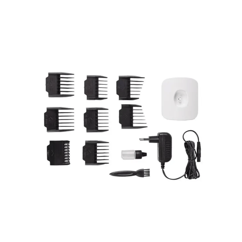 Su motor de doble velocidad permite adaptar la potencia según las necesidades del corte, mientras que el sistema de ajuste de 5 niveles en la cuchilla ofrece una gran versatilidad y control para obtener acabados detallados y personalizados. Gracias a su batería de litio de alto rendimiento, la máquina ofrece hasta 4 horas de autonomía tras una carga completa de solo 3 horas, ideal para largas jornadas de trabajo sin interrupciones.