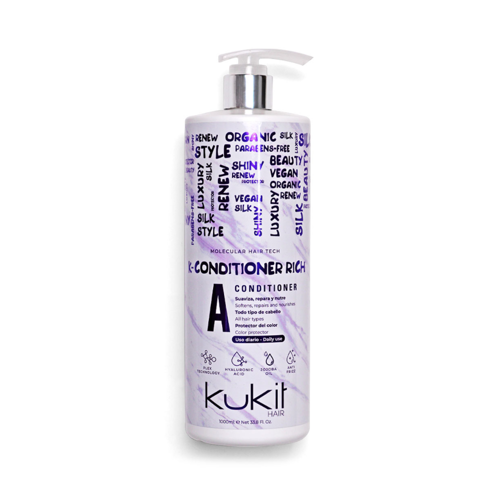 La Mascarilla KUKIT K-CONDITIONER Rich (1000 ml) es el acondicionador reparador ideal para el cuidado diario de tu cabello. Su fórmula está diseñada para suavizar, reparar y nutrir profundamente, proporcionando una hidratación intensa que devuelve la flexibilidad natural a cada hebra. Este producto no solo fortalece la fibra capilar, sino que también protege el brillo y preserva el color, manteniendo tu cabello saludable y radiante.