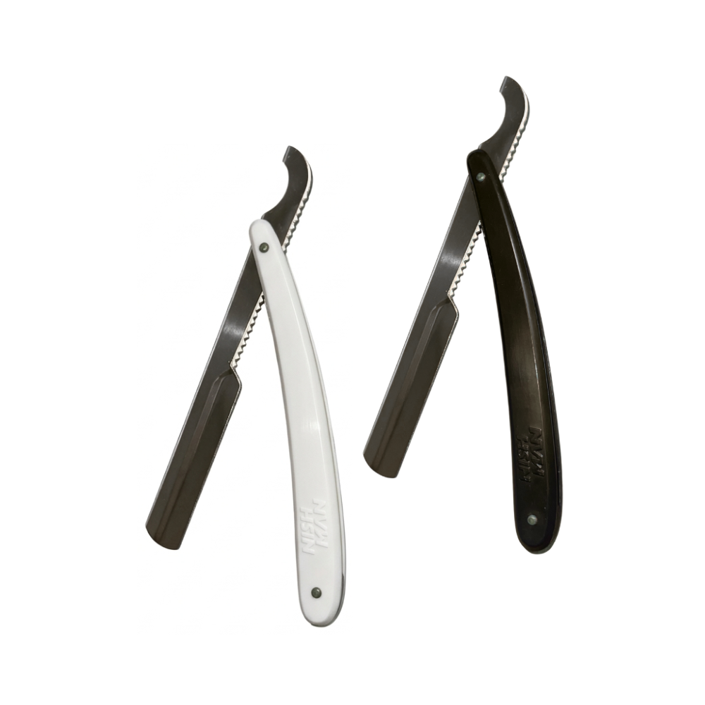 La NAVAJA Turca Afeitado NISHMAN Negra/Blanca es una herramienta clásica reinventada para el barbero moderno que busca precisión, estilo y funcionalidad. Con un diseño minimalista y profesional, esta navaja está fabricada con materiales de alta calidad que garantizan un uso duradero y seguro. Su mango negro ergonómico, hecho de plástico resistente, proporciona un agarre firme y cómodo, permitiendo un control total durante el afeitado o perfilado de barba.