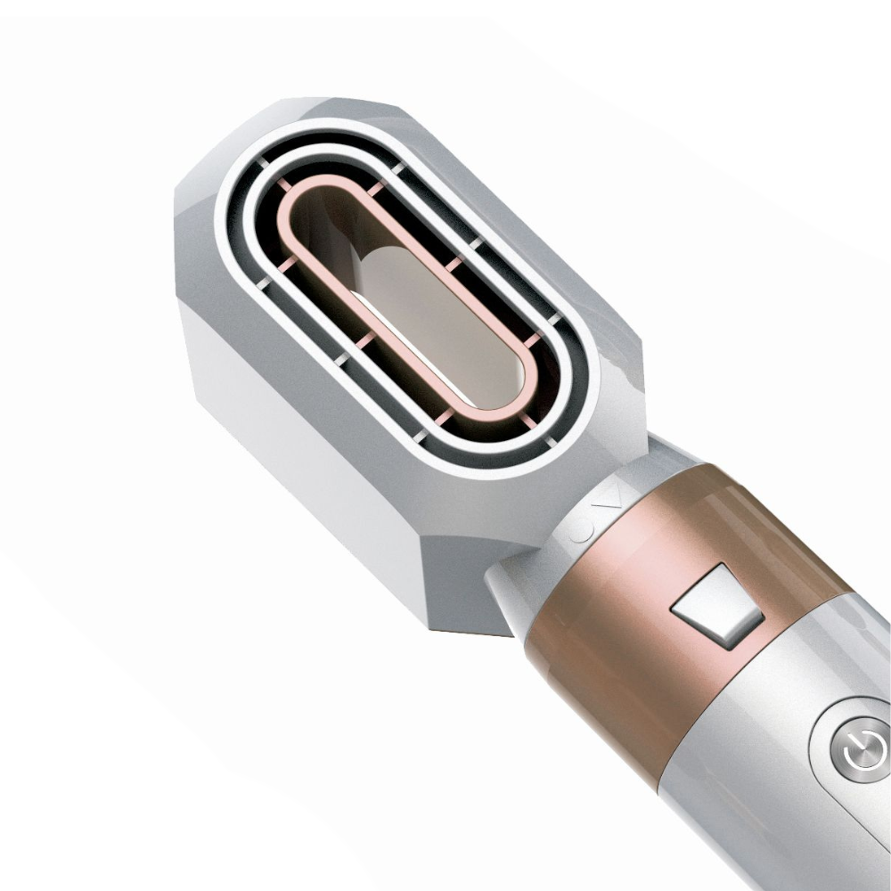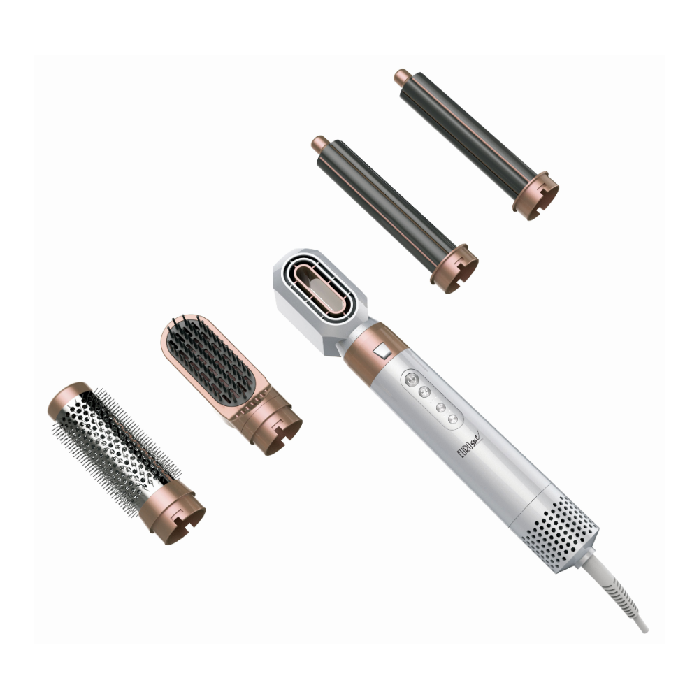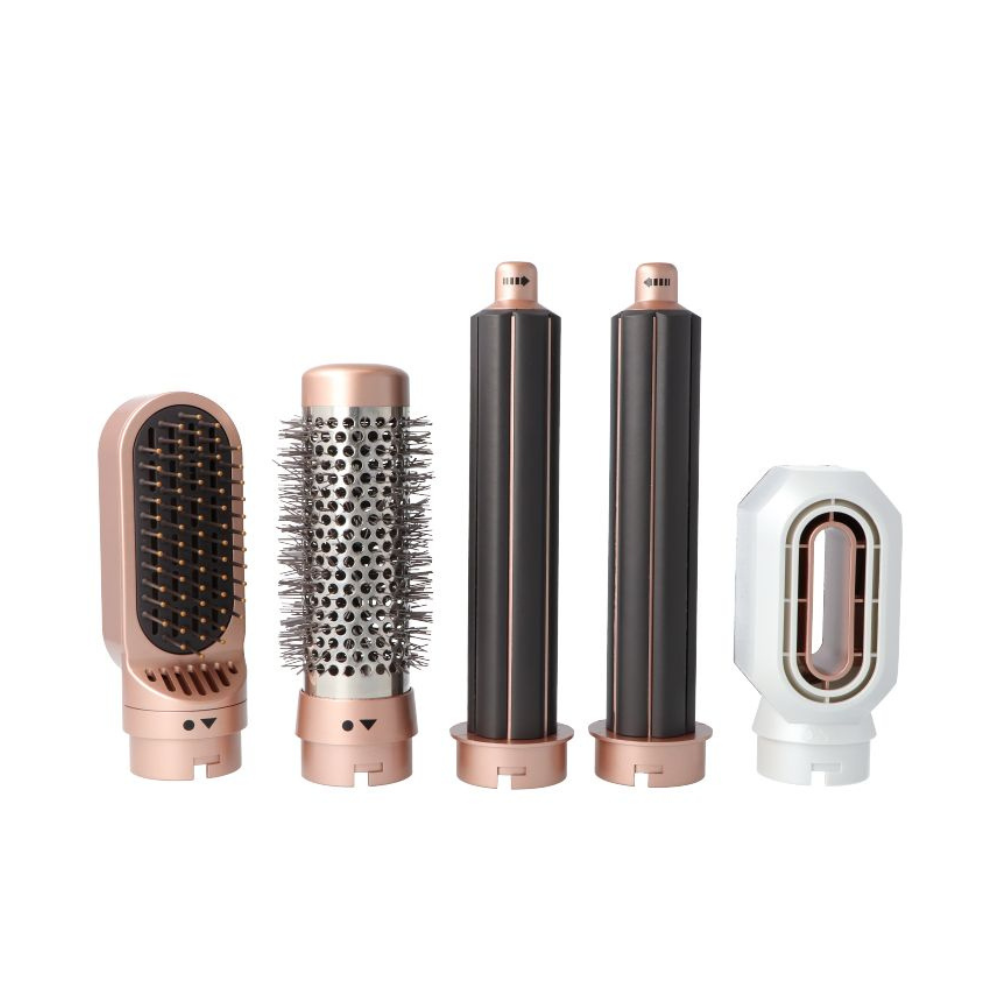 Este secador incorpora 5 accesorios intercambiables, pensados para crear diferentes estilos con facilidad. Incluye una boquilla concentradora para un secado dirigido, un cepillo redondo ideal para aportar volumen y movimiento, un cepillo alisador para acabados suaves y pulidos, y dos barriles rizadores que permiten crear ondas y rizos definidos con un acabado profesional.