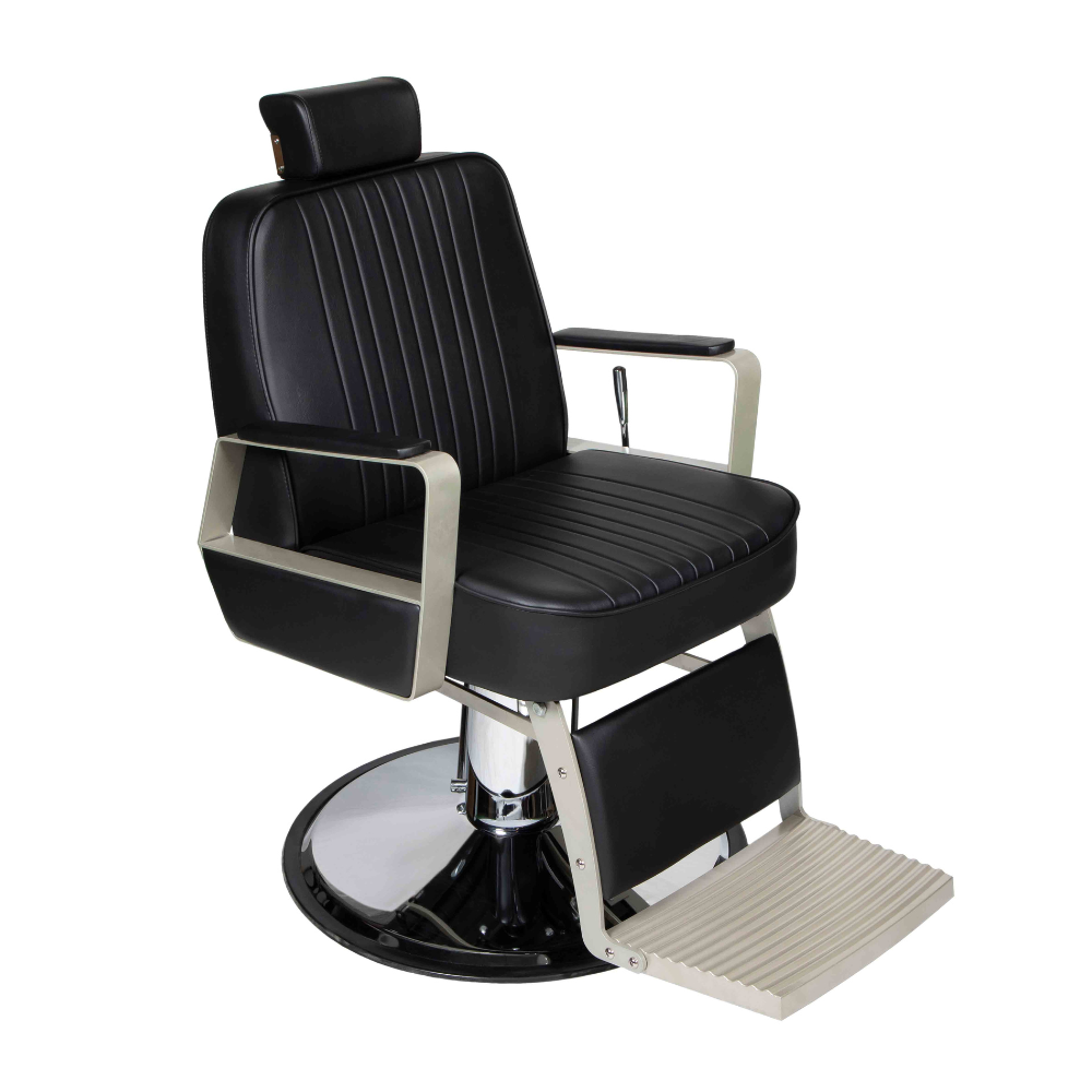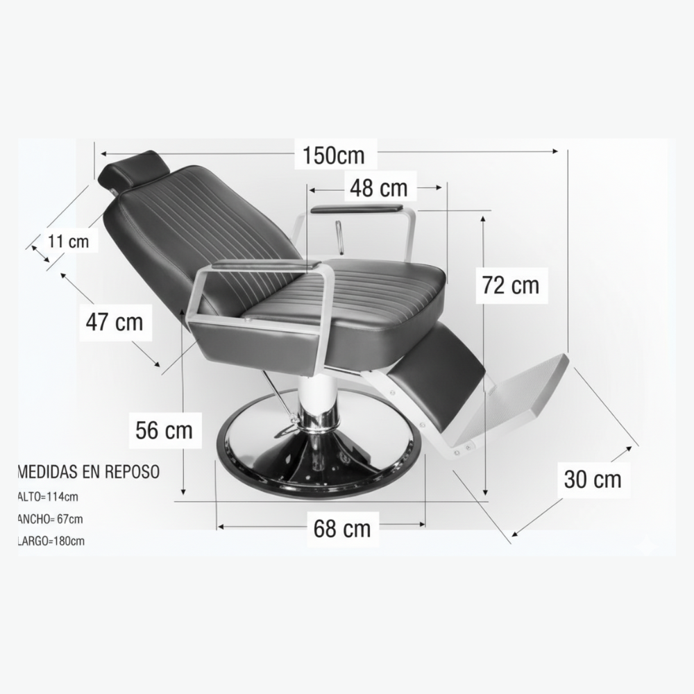 El Sillón caballero CENTURY – Negro ofrece confort y durabilidad, con espuma de alta densidad en asiento y respaldo. Cuenta con mecanismo hidráulico de elevación con freno y bloqueo de seguridad. Sus brazos de aluminio tienen superficie superior tapizada. El respaldo es reclinable y el cabezal extraíble, proporcionando adaptabilidad y ergonomía en cada servicio. Es la opción ideal para barberías que buscan resistencia, comodidad y funcionalidad profesional.