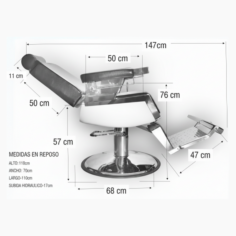 El Sillón caballero IRON – Negro combina robustez y estilo. Tiene un peso de 80 kg y cuenta con espuma de alta densidad en asiento y respaldo para mayor comodidad. Incorpora mecanismo hidráulico con freno y bloqueo de seguridad, brazos y estructura cromada con superficie tapizada, y embellecedores de poliestileno blanco y acero inoxidable. Su respaldo reclinable, cabezal extraíble y apoyapiés de inox reversible con tapizado apoya-piernas facilitan la adaptación a distintos servicios. Es la elección ideal para barberías que buscan durabilidad, confort y un diseño clásico con toque moderno.