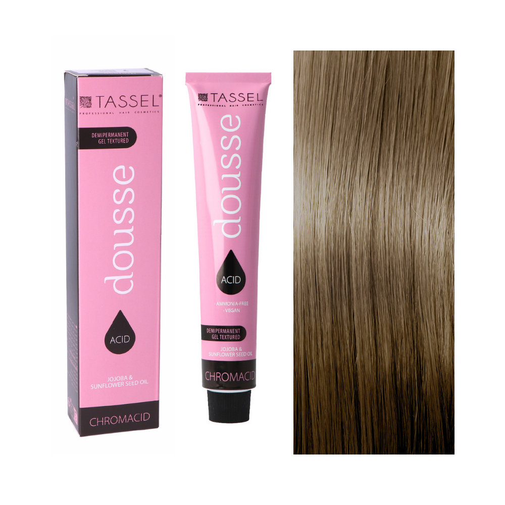 El Tinte Ácido DOUSSE by TASSEL – CHROMACID es una coloración semipermanente sin amoníaco ideal para matizar y mantener el color. Aporta brillo, suavidad y un acabado natural. Enriquecido con aceites nutritivos. Perfecto para prolongar el tono entre coloraciones.