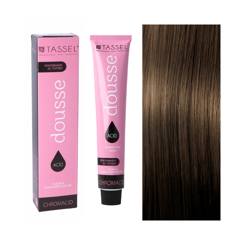 El Tinte Ácido DOUSSE by TASSEL – CHROMACID es una coloración semipermanente sin amoníaco ideal para matizar y mantener el color. Aporta brillo, suavidad y un acabado natural. Enriquecido con aceites nutritivos. Perfecto para prolongar el tono entre coloraciones.